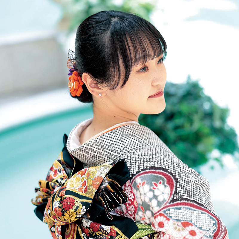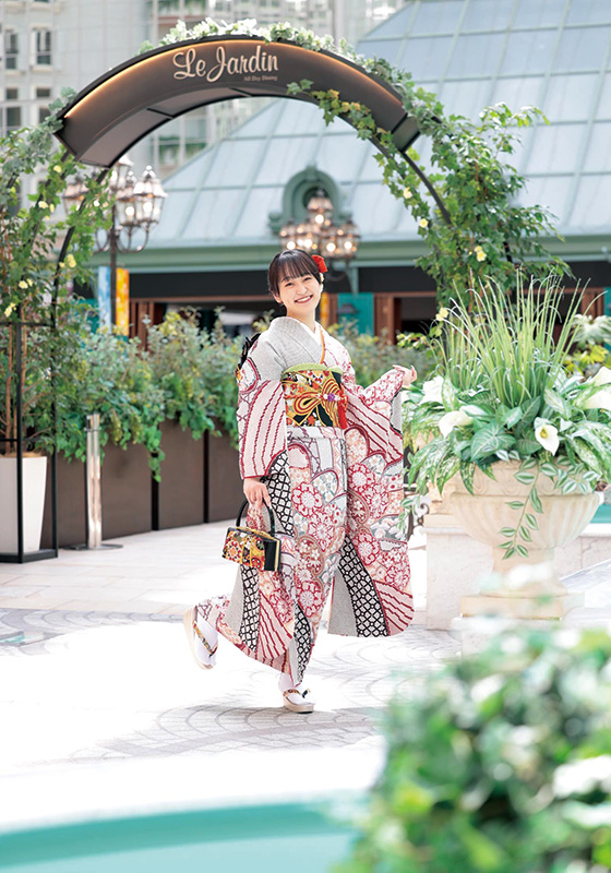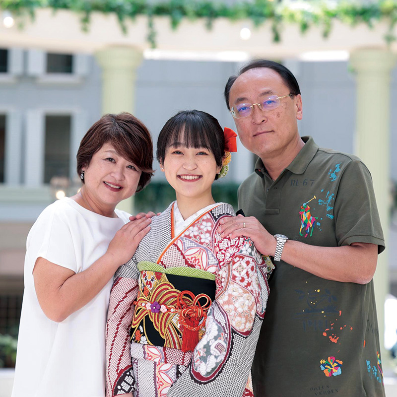 豪華な絞りの振袖姿で、モデル気分を満喫されたお嬢様。「三姉妹共通の振袖に、花音らしい小物を新調しました。帯締めと髪飾りの色を合わせたのがオシャレのポイントです。開放感ある場所で撮影できて本当にいいですね」とお母様。キラキラ笑顔のお嬢様に、ご両親が寄り添う姿も素敵でした。