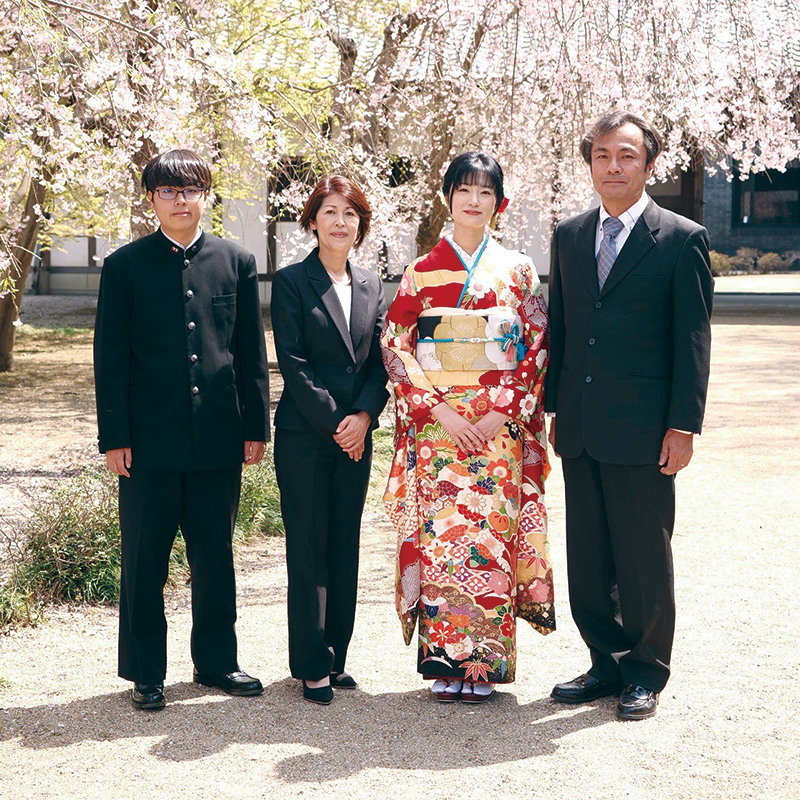 振袖も帯も小物も全てお嬢様好みでセレクト。雅やかな着姿でご家族の愛情に包まれました。「栗田美術館は初めて訪れましたが、とてもいいですね。ロケ撮影にこだわりのなかった娘ですが、撮影が始まると、気分がのってきて、とても楽しんでいました」とお母様です。