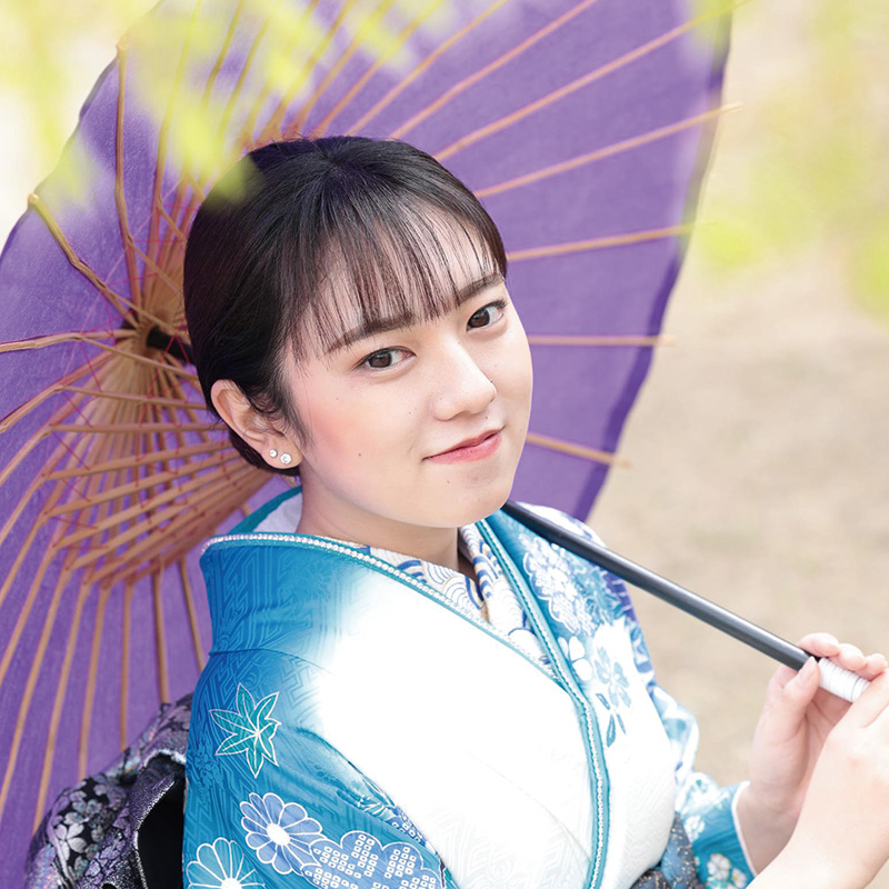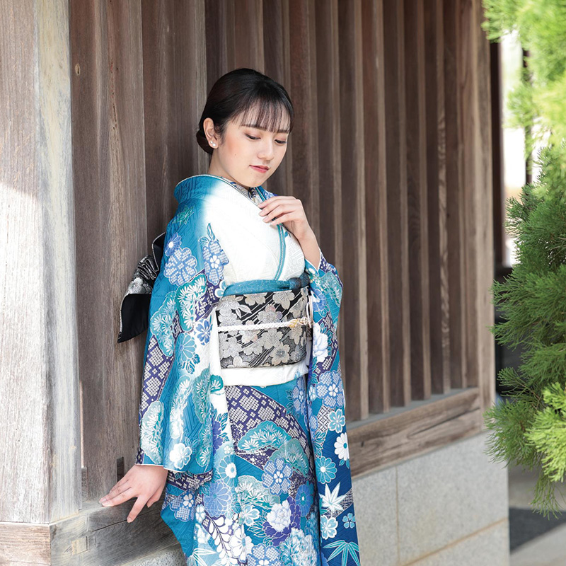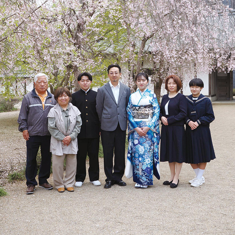 淡いピンクの桜を背景に、白&ブルーのキレイな色合いの振袖姿が映え、ご家族みんなの祝福を受けたお嬢様。「いつもと違い、女性らしいです」と弟さんと妹さん。お二人ともニコニコとしながら、美しいお嬢様の振袖姿を見守る姿が印象的でした。