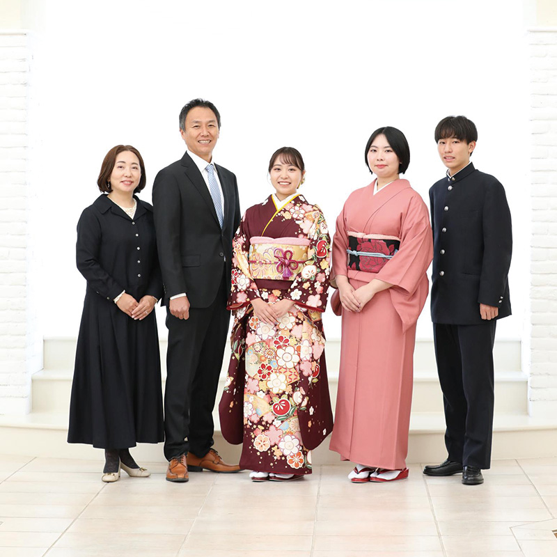 「この振袖は父親と娘で相談して決めたものです。流行に左右されず上品な感じで、小柄な娘ですが大人の女性らしく見えました。前撮りは姉のときに体験しているので、リラックスして撮れたようです。姉もきもの姿で参加させていただきました」とお母様です。