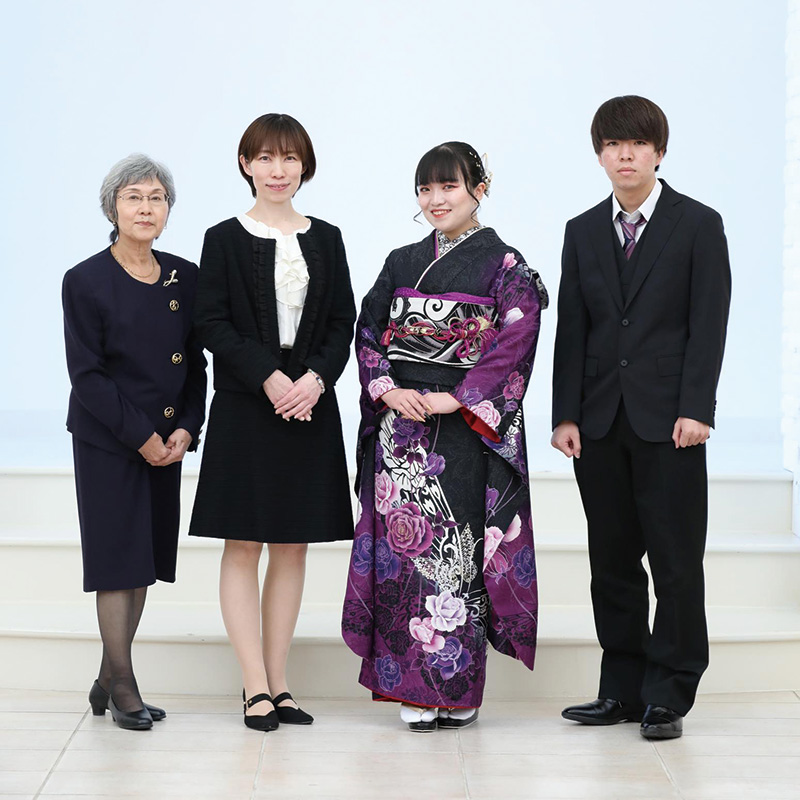 「カッコイイ系やモード系が希望で、この振袖は黒地に好きな紫色と大きな花や蝶の柄が素敵で決めました。振袖姿は思った以上にカッコ良くなり、特別感や振袖の重みを感じることができました。写真は撮るのも撮られるのも好きなので前撮りは本当に楽しかったです」とお嬢様です。