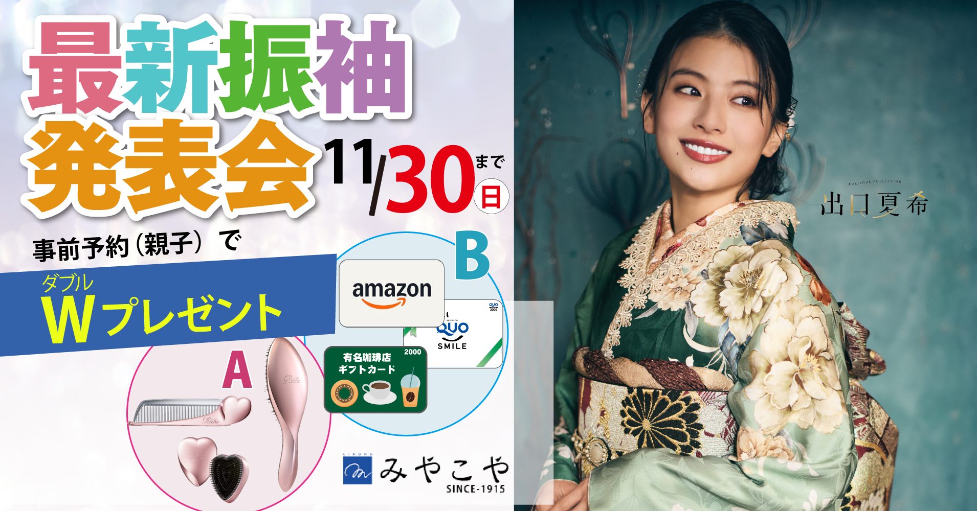 みやこやでは、11月30日(日)まで、みやこや足利本店・太田店の「最新振袖発表会」を開催します。